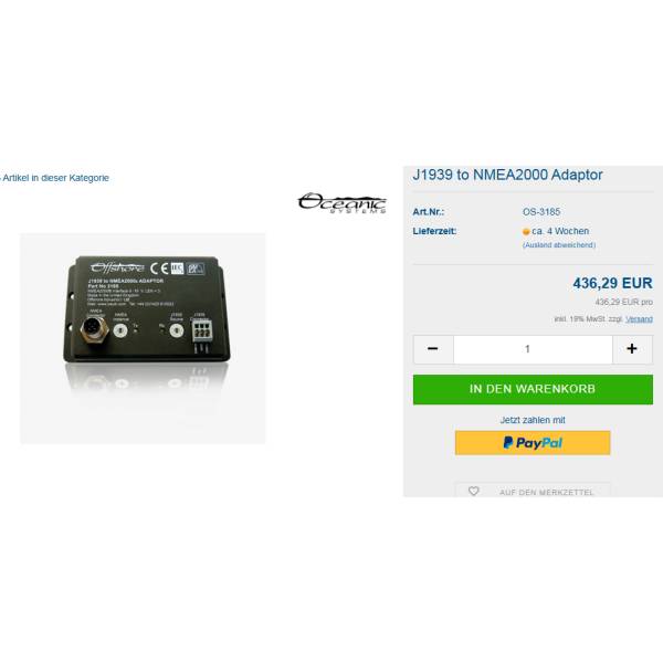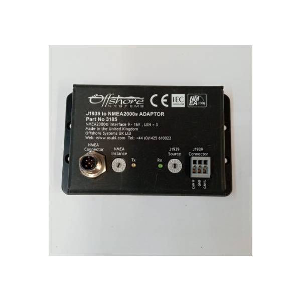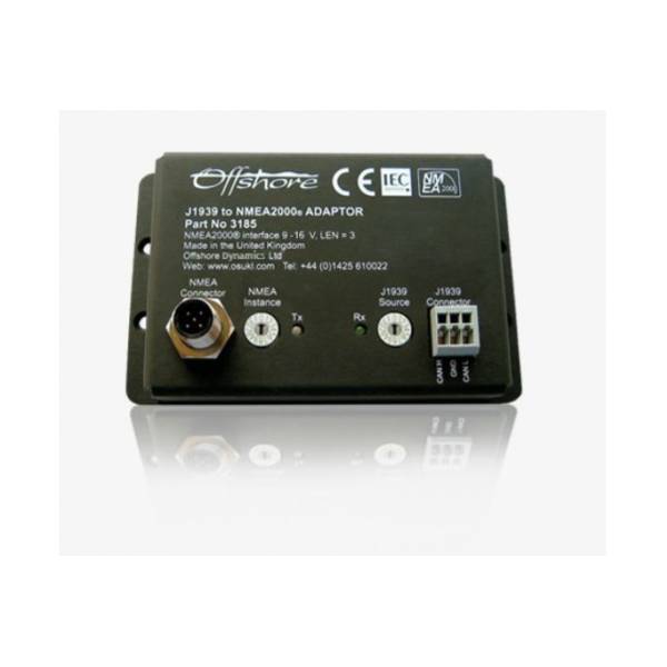 https://mercanautic.com/en/electronics/99644-offshore-systems-gangway-j1939-to-nmea2000-adapter.html99644Offshore systems gangway J1939 to NMEA2000 AdapterThe Oceanic Systems adapter transmits J1939 standard transmission and engine messages to the NMEA2000 network. The J1939 interface is optically isolated and read-only, so no messages are sent to the interface for security reasons.https://d2sxf2zv5uy14a.cloudfront.net/1601691-home_default/offshore-systems-gangway-j1939-to-nmea2000-adapter.jpg253.6instockOffshore253.6253.6001739190008000/Electronics/Accessories, cables and computers/Electronics