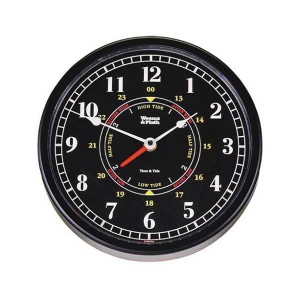 The Trident Time and Tide wall watch features white, eye-catching and easy-to-read letters in a black dial. The time is marked with white handles while the rising and lowering of the tide is indicated with a red handy.