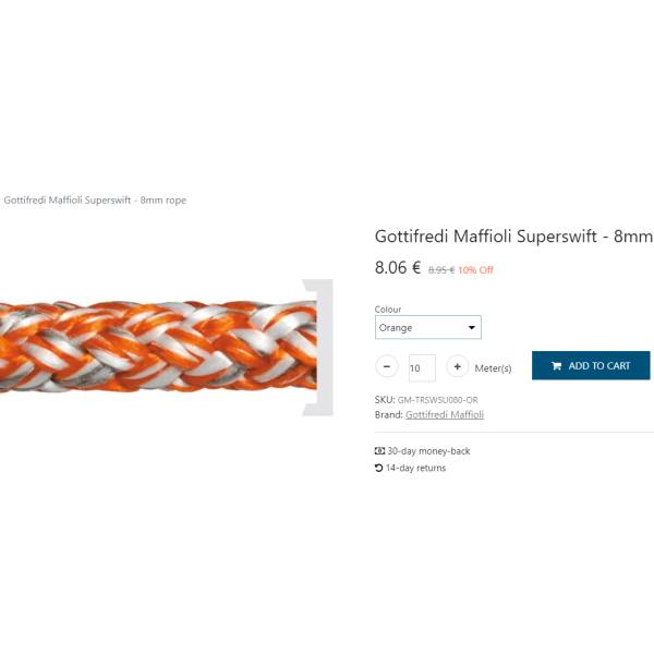 Gottifredi Maffioli cabo dyneema 6.5 mm SUPERSWIFT El Superswift de Gottifredi Maffioli es imprescindible para todos los regatistas de embarcaciones ligeras y de quilla pequeña que buscan algo especial para sus escotas. Superswift es una construcción de doble trenza con un núcleo 78 compacto y de baja elasticidad con una cubierta de fibra...