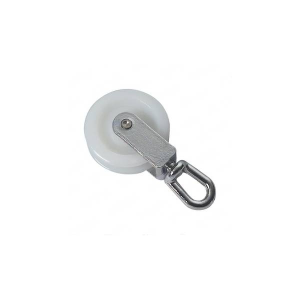 Poulie basculante pivotante avec pont en laiton et réa en nylon. 50mm de diamètre